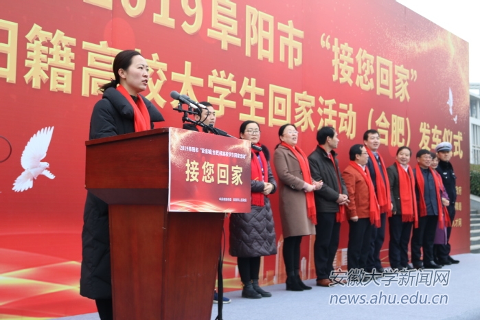 本网讯(新闻中心 王晗颖)由阜阳市委市政府组织的赴合肥高校接阜阳籍大学生回家活动发车仪式于1月19日上午在我校文典阁西广场举行。阜阳市团委副书记王静主持仪式。参加接大学生回家活动发车仪式的有:安徽省人社厅就业失业处处长吕泉,安徽团省委学校部副部长徐波、安徽省人才中心副主任余松柏、安徽大学学生处处长余照务、阜阳市人社局副局长董晓红、阜阳市人才中心毛铁军主任、新安人才网主任朱文颖及阜阳市“接您回家”活动指挥部成员单位的服务人员、青年志愿者和“微宣讲”人员。