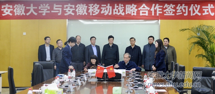 本网讯(网络信息中心)1月24日下午,我校与中国移动安徽分公司在安徽省移动公司签署战略合作协议。校党委书记李仁群和安徽移动党委书记、董事长、总经理钱力出席会议并致辞,安徽大学副校长俞本立和安徽移动副总经理陈炜分别代表安徽大学和安徽移动签订合作协议,双方相关部门负责同志一同参加签约仪式。