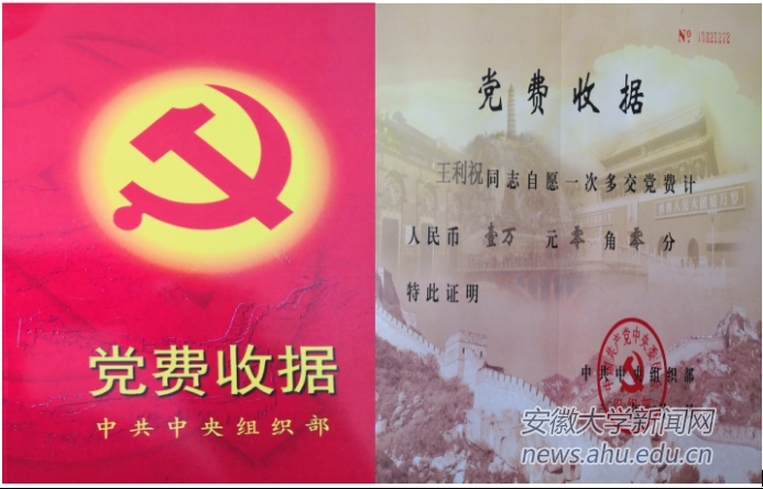 本网讯(商学院 赵成名)日前,校党委组织部收到中共中央组织部开具的一份“党费收据”,内容显示:“王利祝同志自愿一次多交党费计人民币壹万元零角零分,特此证明”。 收据系我校商学院已故退休老党员王利祝老师的家属按照其生前遗嘱上缴的党费收缴证明,表现出一位老党员坚强的党性观念、坚定的政治信仰和对党的无限忠诚与热爱。