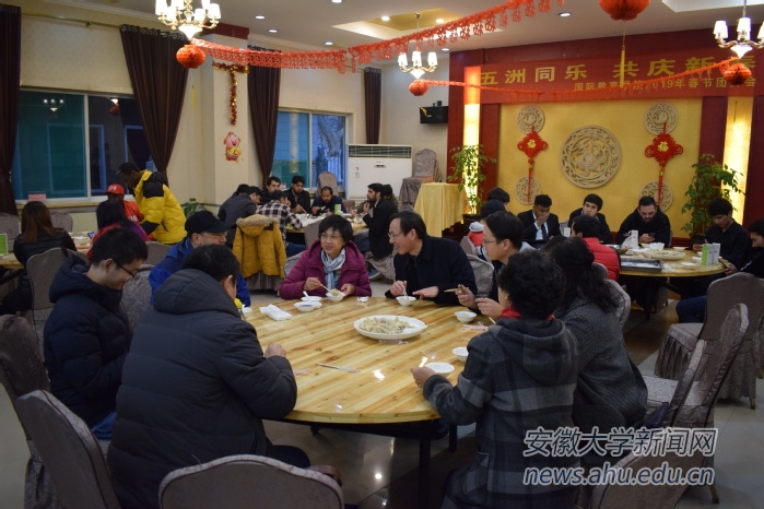 程雁雷亲切慰问了留学生,向他们致以新年祝福,并同师生们共同品尝了现场制作的饺子。她充分肯定了国际教育学院2018年在留学生招生与培养方面取得的显著成绩,对今后的留学生工作寄予厚望。随后,程校长与全体师生共进晚餐并合影留念。