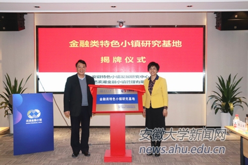 为探索形成可复制可推广的金融类特色小镇建设“安徽模式”,安徽大学与合肥滨湖金融小镇合作共建全国首家金融类特色小镇研究基地。罗云峰与程雁雷共同为“金融类特色小镇研究基地”揭牌。