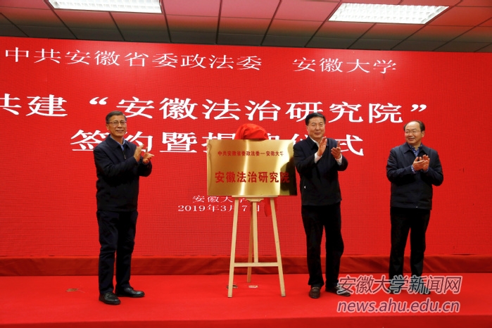 省委常委、政法委书记姚玉舟,省委教育工委书记钱桂仑,校党委书记李仁群共同为“安徽法治研究院”揭牌。省委政法委秘书长李国庆与我校党委副书记、常务副校长王群京签署共建协议。