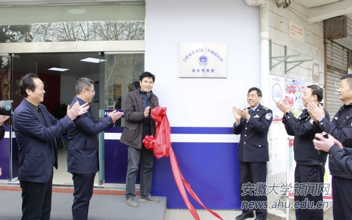 本网讯(保卫处)3月8日上午,合肥市公安局三里庵派出所安徽大学警务室揭牌仪式在我校龙河校区举行,校党委常委、副校长虞宝桃、合肥市公安局副局长杨援军共同为警务室揭牌。