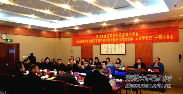 本网讯(哲学系 江婷婷)2019年3月10日上午,由我校哲学系霍书全教授担任首席专家的国家社科基金重大项目“面向自然语言理解的逻辑构建和符号接地问题的哲学、心理学研究”开题报告会在安徽大学磬苑宾馆举行。来自北京大学、中国社会科学院、南开大学、武汉大学、华中师范大学等高校与科研院所的近二十余位专家学者参加了本次会议。校党委书记李仁群出席了报告会并致辞。会议由校人文社科处副处长方平主持。
