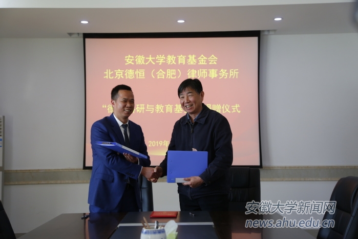 本网讯(新闻中心 宋慕妍 肖静薇 姚家宁)3月12日下午,安徽大学教育基金会、北京德恒(合肥)律师事务所“德恒科研与教育基金”捐赠仪式在磬苑校区法学院大成国际会议中心举行。安徽大学教育基金会秘书长郁建民与北京德恒(合肥)律师事务所主任胡正安签约,并颁发了捐赠证书。会议由我校法学院党委书记宋玉茹主持。