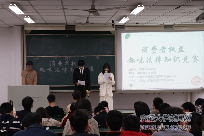 晚上七点,我校法律援助志愿者协会联合十佳社团在博学北楼举办了消费者权益趣味知识竞赛。这次竞赛,设置了名词解释题、抢答选择题、谜语等不同题型,通过分组竞答的方式来赢取最终的奖品,这激发了各学院同学的参与热情,也让他们在体验快乐与成就感的同时,积累了许多有关消费者权益的法律知识。法学院的同学告诉我们,他们希望通过这次活动,使同学们体会到法学的奥秘,领略到法学的内涵。他们还补充道,希望同学们日后能够自觉地运用法律知识来维护自己的合法权益。
