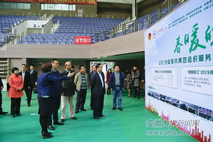 共青团安徽省委党组书记、书记孔涛,安徽大学党委副书记、常务副校长王群京,团省委党组成员、副书记李波、张敏,安徽大学党委常委、副校长薛照明,校团委书记高贵和等来到招聘会现场了解情况,指导招聘工作。孔涛深入求职大学生和用人单位群体中,与他们进行了充分交流,仔细询问大学生求职和企业用工需求情况,并指出,“春暖皖江”公益招聘会要服务青年就业,提供创新创业的机会,搭建起企业和优秀青年之间的桥梁。