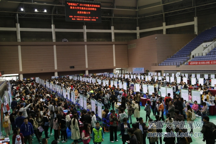 本网讯(新闻中心 宋怡然 朱小曼 姚家宁)3月27日,“春暖皖江” 2019安徽共青团组织服务大学生就业公益招聘会在安徽大学磬苑校区体育馆举行。此次招聘会由共青团安徽省委员会、安徽省学生联合会、安徽省青年企业家协会、安徽省青年创业者协会、安徽省大学生创新创业促进会、安徽省青年创业就业基金会联合主办,由安徽大学和新安人才网承办,共有189家用人单位来到现场,为我校毕业生提供多种专业、多样类型的工作岗位。