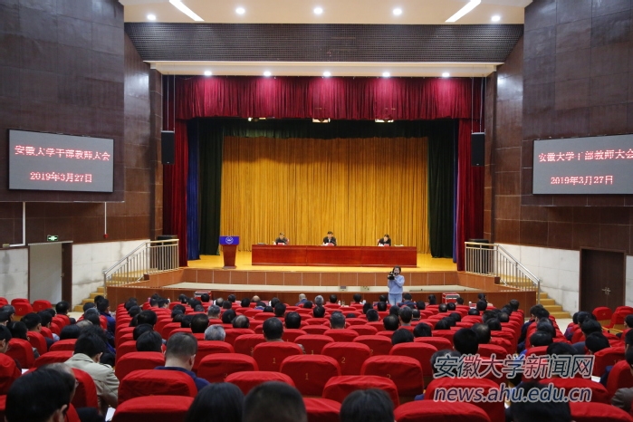 本网讯(新闻中心 朱子鹏 李鹃 殷学如) 3月27日,学校领导班子和领导人员2018年度综合考核干部教师大会在磬苑校区艺术楼小剧场召开。省委综合考核组第十八组组长、省委党校(安徽行政学院)常务副校长(副院长)张永,省委综合考核组第十八组副组长、省教育厅副厅长储常连及考核组其他成员出席会议。校领导,机关部门领导成员、院系等教学单位和直属附属单位党政正职(含主持工作的副职),正高职称人员、在校省级以上“两代表一委员”、民主党派市以上主委、教代会执委和学生代表出席会议。校党委书记李仁群主持会议。