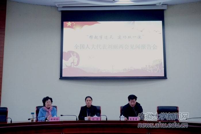 本网讯(新闻中心 宋怡然)3月28日下午,全国人大代表、“最美洗脚妹”、丽行公益发起人刘丽应邀来我校作两会见闻和女教职工保健养生报告。报告会在磬苑校区办公楼B204会议室举行,安徽大学工会主席王景峰,女知识分子联谊会会长郑明珍出席报告会。
