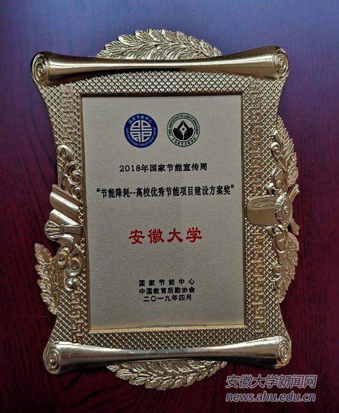 2019年4月13日,在“中国教育后勤协会能源管理专业委员会第一届第五次全体委员大会暨2018年年会”上,进行了集中表彰,颁发了奖牌和证书。我校是安徽省唯一获得此奖项的高校,也是我校继2018年以来先后获得“全国教育节能示范单位”、“国家级节约型公共机构示范单位”之后,获得的又一荣誉。