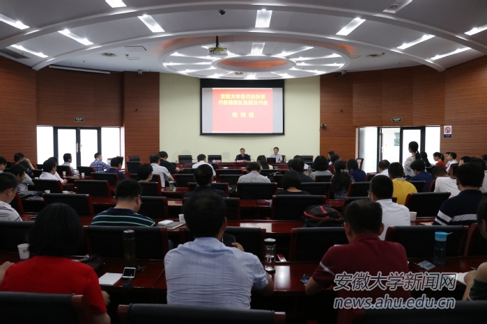 本网讯 (新闻中心 陈雪 马君)6月5日下午,安徽大学教代会执委、代表团团长和部分代表培训班在磬苑校区办公楼B204会议室举办。会议由校党委书记李仁群主持。安徽省政协教科文卫体委员会原副主任杨玉华和安徽省人大常委会人事代表选举工委代表联络办公室主任徐丛华分别就相关主题作报告。
