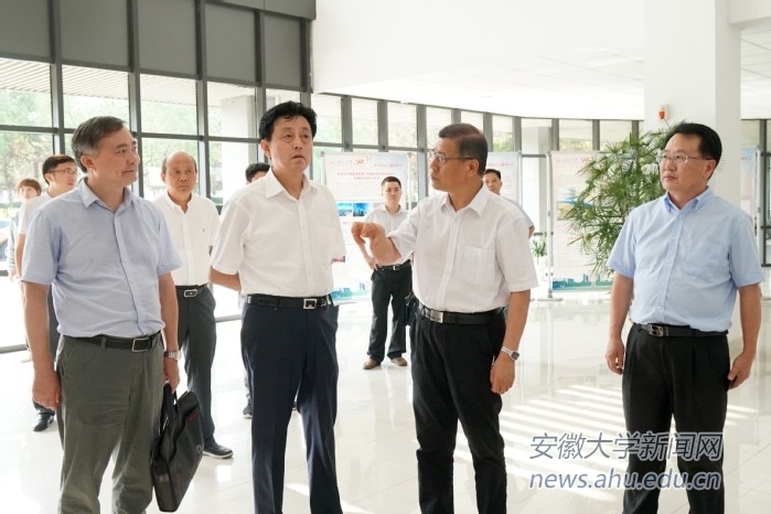本网讯(新闻中心 宋怡然 朱小曼)7月2日下午,全国人大常委会委员、省人大常委会副主任谢广祥一行来我校调研。在校党委书记李仁群,校党委副书记、常务副校长王群京的陪同下,谢广祥一行视察调研了安徽省高校网络思想政治工作中心、我校信息化建设情况及物质科学与信息技术研究院等。
