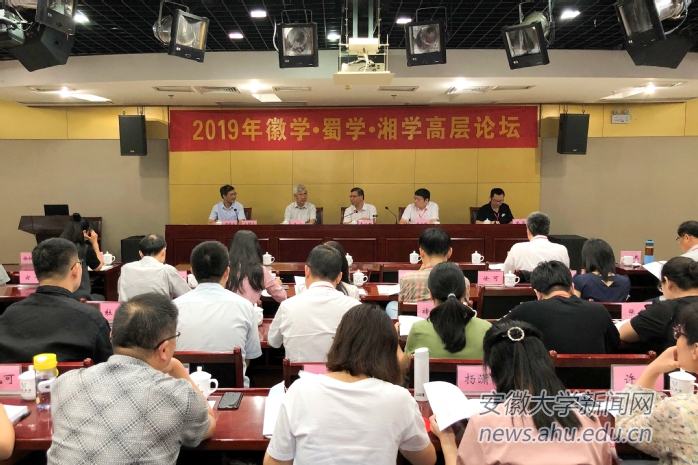 本网讯(新闻中心)7月12-14日,“2019年徽学·蜀学·湘学高层论坛”在我校磬苑校区举办。“徽学·蜀学·湘学高层论坛”是安徽大学、四川大学、湖南大学三所高校共同打造的高端学术品牌,从2018年开始,三方轮流承办,每年一次,旨在汇聚海内外学者力量,共同研讨“湘蜀徽”三学内在关联与互鉴,推进地域文化与主流文化创新与发展。首届论坛在湖南大学岳麓书院举办。