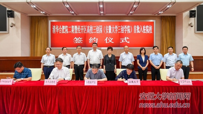 本网讯(新闻中心)7月26日上午,清华大学合肥公共安全研究院二期暨经开区高校三创园(安徽大学三创学院)首批入驻院校签约仪式在市政务中心举行。我校和中科院核能安全技术研究所等3家院校12个产业化项目首批入驻。合肥市市长凌云,市委常委、合肥经开区管委会主任杨伟,副市长吴春梅、朱策,市政府秘书长罗平,清华大学党委常委、副校长尤政,校党委书记李仁群,校党委常委、副校长薛照明等出席。