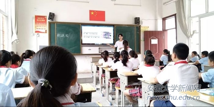 “我们能一步一步脱离贫困,正是因为我们伟大的祖国母亲”。最后,团队成员和老师、小朋友们共同唱响黑板上标注了标准汉语拼音的《歌唱祖国》,大家都字正腔圆,饱含深情,唱得格外响亮。