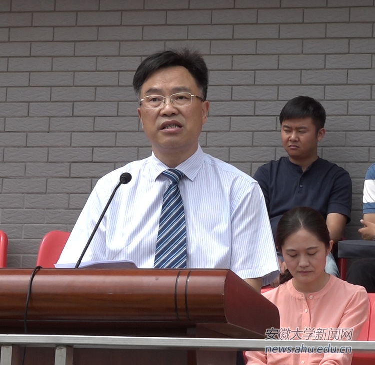 校长匡光力发表致辞,他指出,同学们经过半个多月的日晒雨淋与意志磨砺后,收获了集体的成人礼,祝贺同学们成为安大的一份子!成为一名安大人,需要了解安大,读懂安大,更要认同安大。他向同学们介绍了学校的校史和近些年来取得的成就,并提出了三点希望:第一,要严以修身,锤炼品德修养。希望同学们在接下来的大学生活中,树立积极进取、乐观向上的人生态度,努力完善自我,砥砺品格,不断提升自我;第二,要严于律己,增进知识见识。希望同学们尽快适应学习方式和生活环境的变化,心无旁骛求知问学,培养严谨的学风,掌握正确的学习方法,着力夯实专业基础,弘扬劳动精神,积极参加各种文体科技活动,在探索中成长,在实践中进步;第三,要严阵以待,勇担时代大任。希望同学们将奋斗作为青春最亮丽的底色,敢为人先、求真务实,创造青春辉煌。匡光力强调,再过十几天我们即将迎来新中国70华诞,在伟大时代,实现伟大梦想,必须进行伟大斗争、建设伟大工程、推进伟大事业。在安大这片既具深厚文化底蕴又充满自由活力的沃土上,同学们要志存高远,撒播理想的种子,付出耕耘的汗水,收获成长的喜悦,创造精彩的人生。