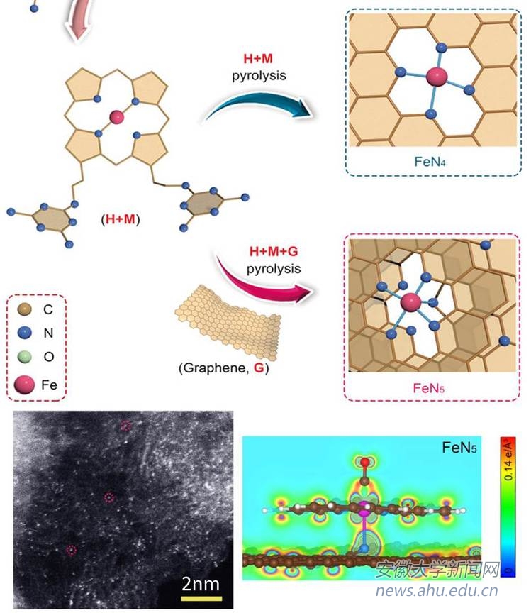 利用可再生能源,把二氧化碳转化为有附加值的产物,一直是人类面临的重要课题,具有挑战性。王教授课题组从原子层次出发设计新型催化剂,通过对氯化血红素和三聚氰胺分子在石墨烯表面的自组装、键合和碳化处理,获得了石墨烯铆钉单原子铁FeN5的新型催化活性中心,催化性能优于所有Fe-N-C型催化剂,在低过电位下,法拉第效率达到97.0%。DFT理论模拟表明,FeN5活性位具有吡咯型N轴向配位FeN4的结构,能有效抵消Fe 3d轨道的电子密度和降低Fe-CO的π反馈效应,有利于产物CO的快速解吸和高选择性的产生。该工作提供了一种石墨烯单原子新材料能升级的制备方法,为二氧化碳的资源化利用也提供了一个科学依据。
