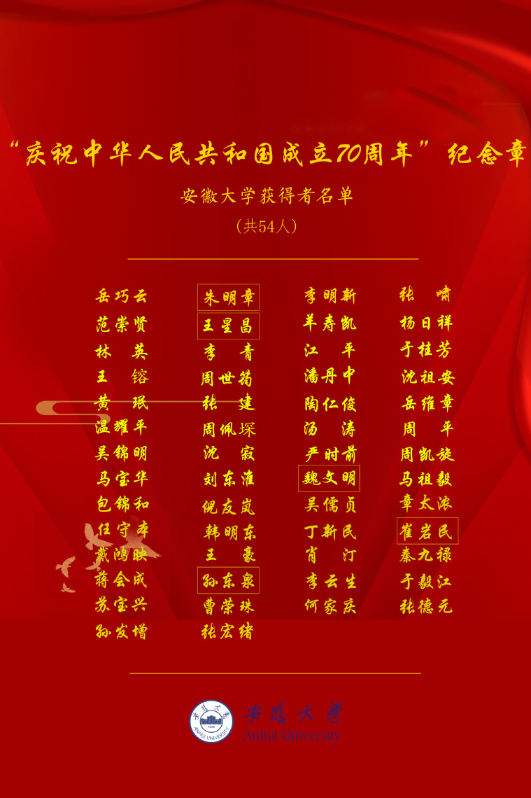 本网讯(新闻中心)近日,中共中央、国务院、中央军委颁发了“庆祝中华人民共和国成立70周年”纪念章,我校共有54位同志获得这项殊荣。