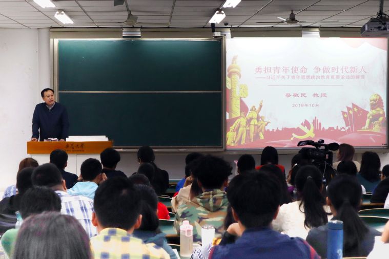 蔡敬民从历史逻辑、现实逻辑、理论逻辑和实践逻辑四个方面为同学们解读了习近平总书记关于青年思想政治教育的重要论述。在历史逻辑层面,回顾了中国共产党重视青年,关注青年思想政治教育工作的光荣传统;在现实逻辑层面,指出了当前青年群体思想政治教育工作的内外环境变化以及出现的问题和解决措施;在理论逻辑层面,解释了习近平总书记关于青年思想政治教育的重要论述的新目标、新内容、新任务、新原则、新路径、新方法;在实践逻辑层面,强调了习近平总书记关于青年思想政治教育的重要论述五个方面的历史贡献。蔡敬民希望安大学子有意识地将习近平总书记关于青年思想政治教育重要论述的基本理论同自己的学习生活有机结合起来,从伟人智慧中汲取思想的营养,用科学理论来武装自己,为中华民族伟大复兴“中国梦”的早日实现贡献力量。