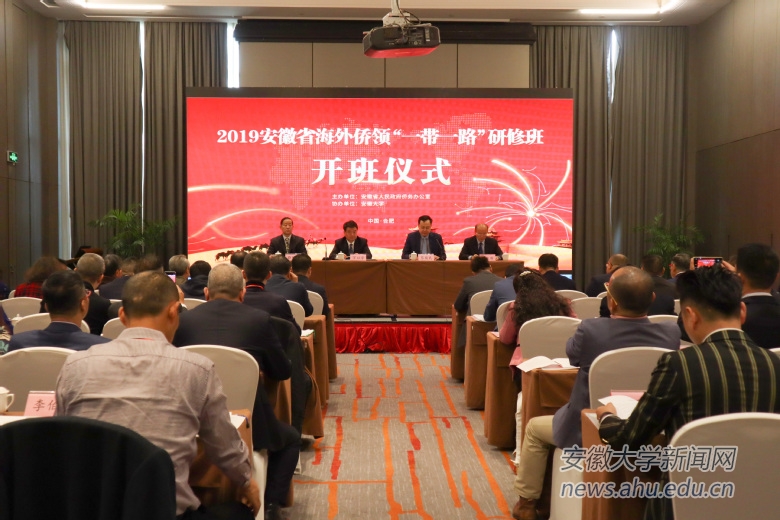 本网讯(新闻中心 宋慕妍)11月23日上午,由安徽省人民政府侨务办公室主办、我校协办的2019安徽省海外侨领“一带一路”研修班在合肥正式开班。安徽省委统战部副部长、侨务办公室主任万以学,校党委书记蔡敬民,副校长薛照明出席开班仪式。