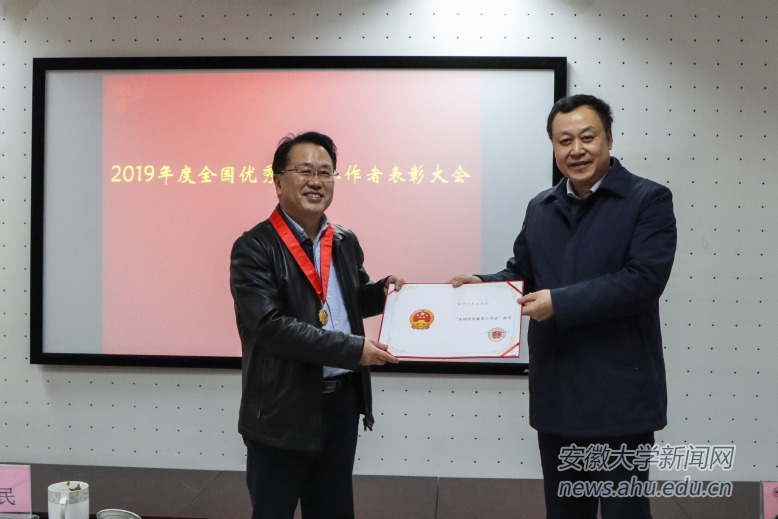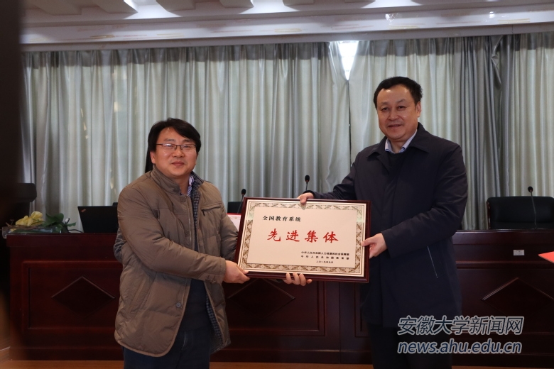 本网讯(新闻中心)今年9月5日,人力资源社会保障部、教育部公布了2019年全国教育系统先进集体、全国优秀教育工作者等表彰对象名单。我校法学院荣获“全国教育系统先进集体”称号,校党委常委、统战部长、物质科学与信息技术研究院党委书记卞光文荣获“全国教育优秀工作者”称号。为表彰获奖单位和个人,12月4日下午,学校分别在法学院、物质科学与信息技术研究院举行了2019年全国教育系统先进集体、优秀教育工作者获得者表彰会。校党委书记蔡敬民出席会议并为获奖单位和个人转发了获奖证书、奖牌。