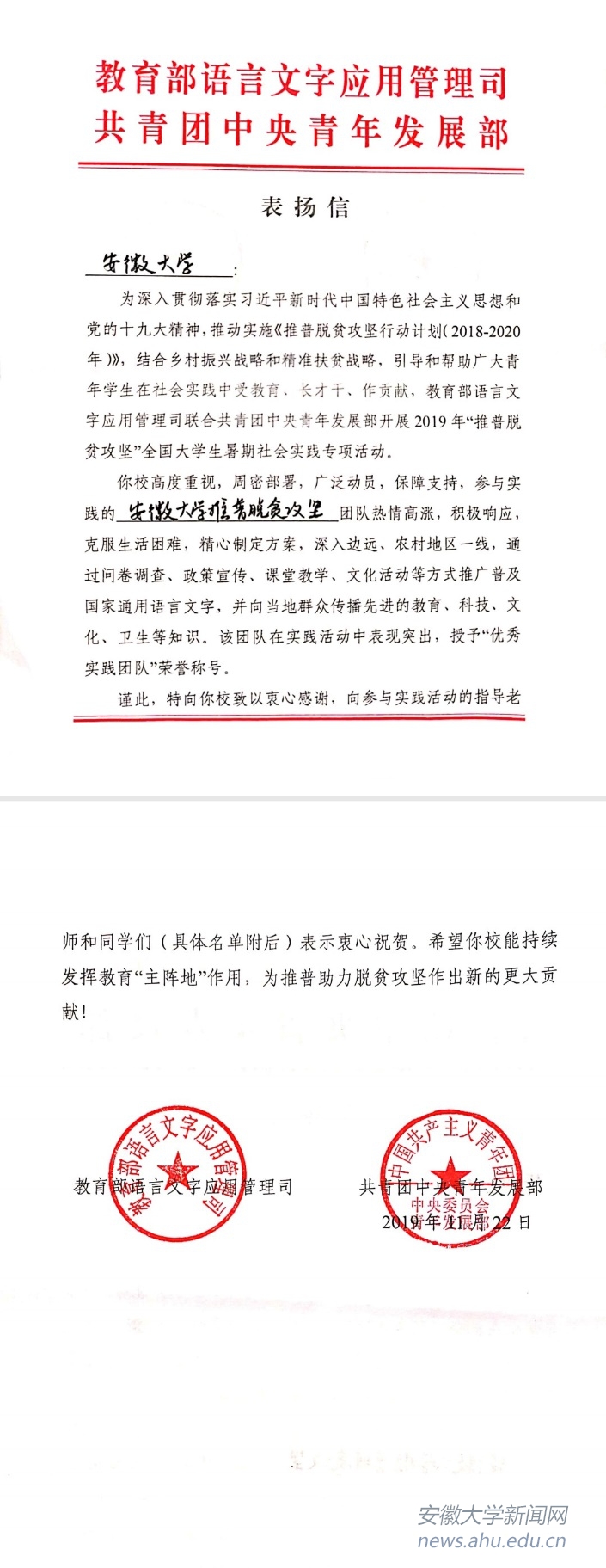 本网讯(校团委)近日,我校“安徽大学推普脱贫攻坚宣调团队”荣获“推普脱贫攻坚”全国大学生暑期社会实践专项活动优秀团队并获得由教育部、团中央有关部门颁发的表扬信。学校还获得由团中央、全国学联共同评选的2019年全国大中专学生志愿者暑期“三下乡”社会实践活动先进单位。