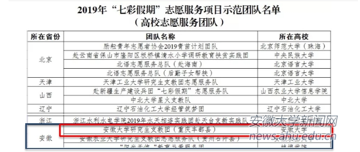 本网讯(校团委)近日,中国青年志愿者协会公布了2019年“七彩假期”志愿服务项目示范团队评选结果,我校研究生支教团获评全国2019年“七彩假期”志愿服务项目示范团队。