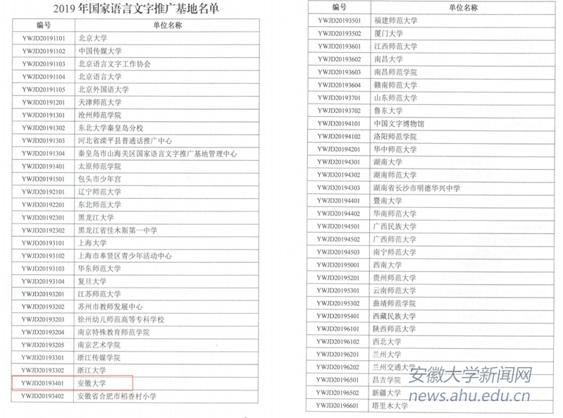 本网讯(人文社会科学处 )近日,教育部公布了首批国家语言文字推广基地名单,我校是安徽省唯一入选高校。该基地由文学院牵头申报,是我校获批的又一个教育部平台。