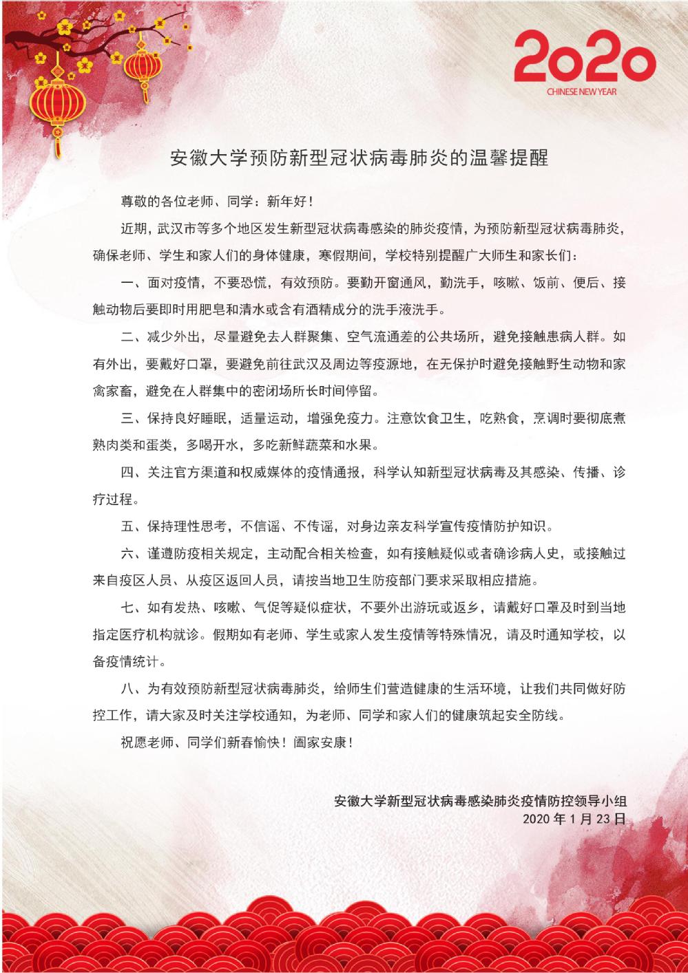 【疫情防控】安徽大学预防新型冠状病毒肺炎的温馨提醒