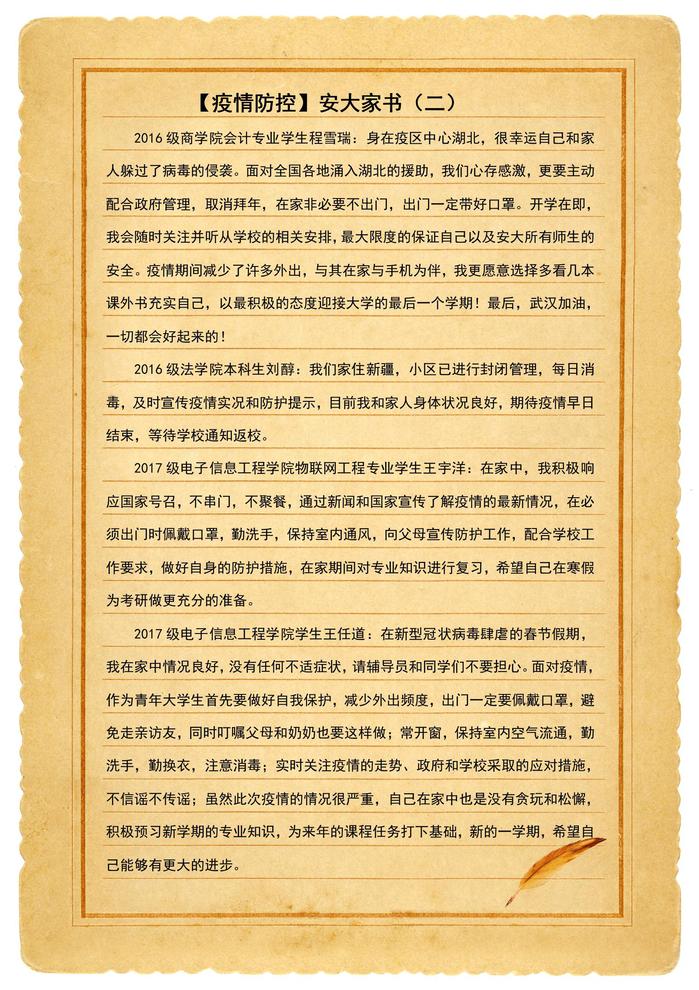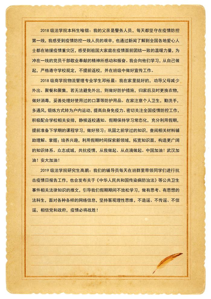 本网讯(新闻中心)新型冠状病毒感染的肺炎疫情发生以来,安大师生积极响应党中央号召,严格落实省委省政府、省教育厅及学校疫情防控领导小组统一部署安排,齐心协力,众志成城。三万多名安大人虽然天各一方,但是心在一起,我们将和全国人民一道打赢这场疫情防控阻击战!