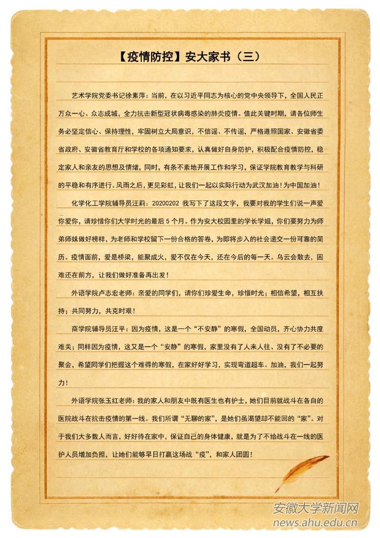 本网讯(新闻中心)新型冠状病毒感染的肺炎疫情发生以来,安大师生积极响应党中央号召,严格落实省委省政府、省教育厅及学校疫情防控领导小组统一部署安排,齐心协力,众志成城。三万多名安大人虽然天各一方,但是心在一起,我们将和全国人民一道打赢这场疫情防控阻击战!