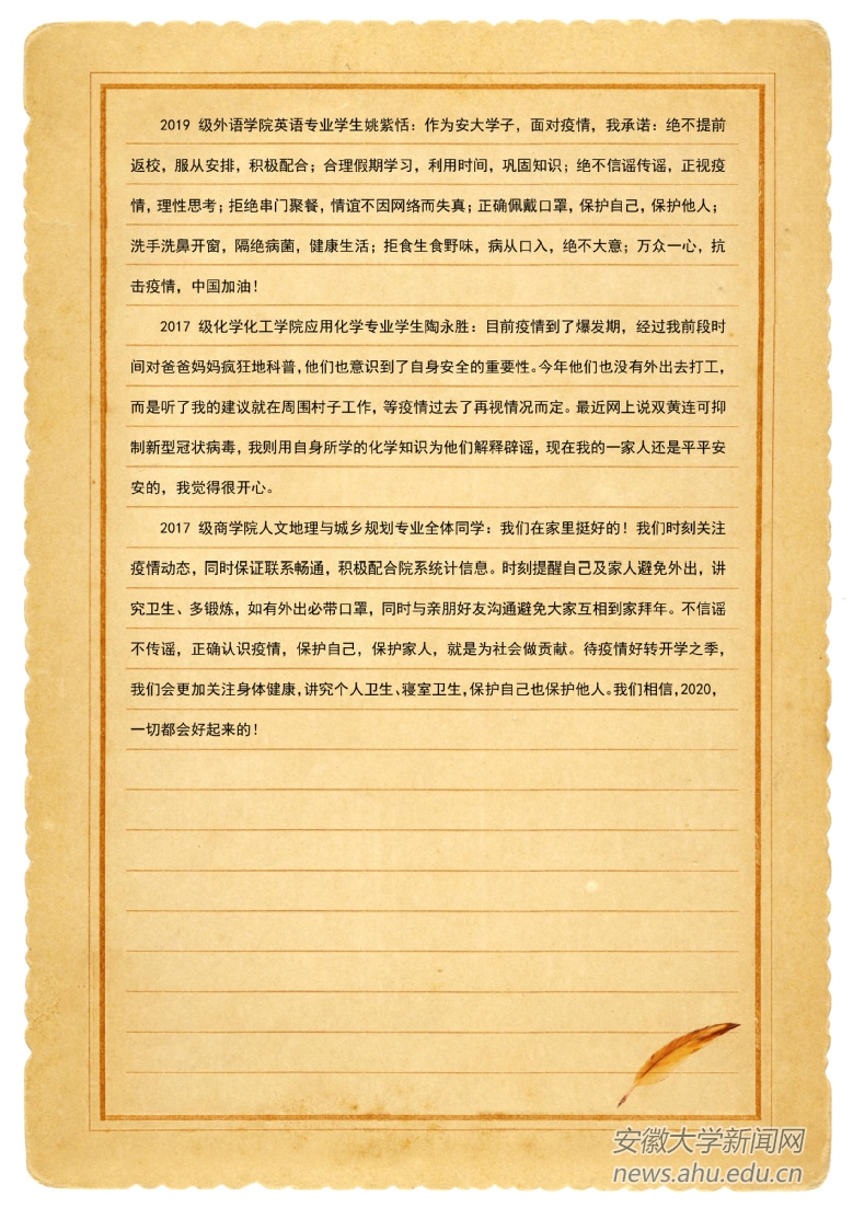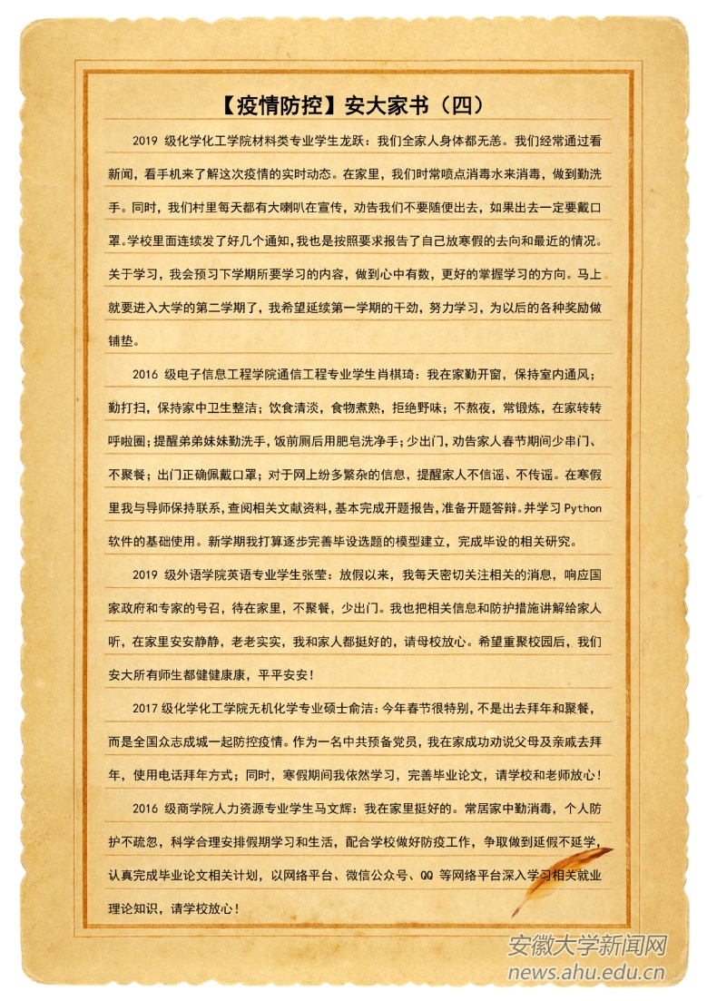 本网讯(新闻中心)新型冠状病毒感染的肺炎疫情发生以来,安大师生积极响应党中央号召,严格落实省委省政府、省教育厅及学校疫情防控领导小组统一部署安排,齐心协力,众志成城。三万多名安大人虽然天各一方,但是心在一起,我们将和全国人民一道打赢这场疫情防控阻击战!