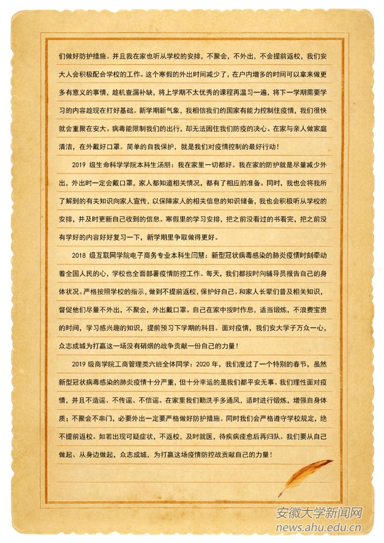 本网讯(新闻中心)新型冠状病毒感染的肺炎疫情发生以来,安大师生积极响应党中央号召,严格落实省委省政府、省教育厅及学校疫情防控领导小组统一部署安排,齐心协力,众志成城。三万多名安大人虽然天各一方,但是心在一起,我们将和全国人民一道打赢这场疫情防控阻击战!
