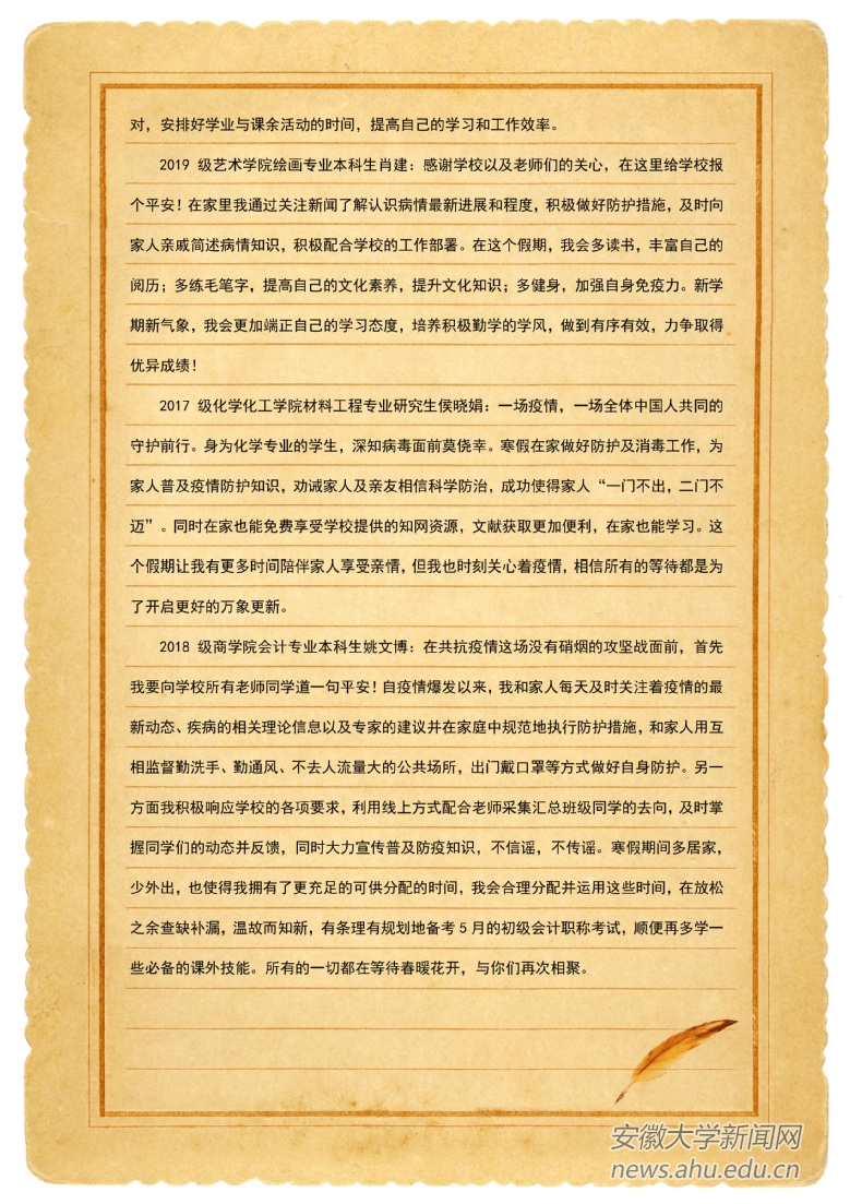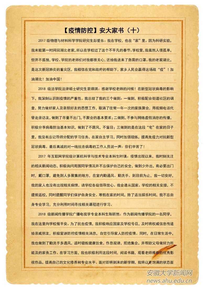 本网讯(新闻中心)新型冠状病毒感染的肺炎疫情发生以来,安大师生积极响应党中央号召,严格落实省委省政府、省教育厅及学校疫情防控领导小组统一部署安排,齐心协力,众志成城。三万多名安大人虽然天各一方,但是心在一起,我们将和全国人民一道打赢这场疫情防控阻击战!