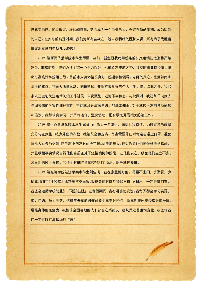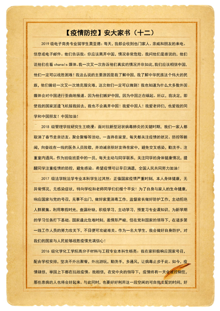本网讯(新闻中心)新型冠状病毒感染的肺炎疫情发生以来,安大师生积极响应党中央号召,严格落实省委省政府、省教育厅及学校疫情防控领导小组统一部署安排,齐心协力,众志成城。三万多名安大人虽然天各一方,但是心在一起,我们将和全国人民一道打赢这场疫情防控阻击战!