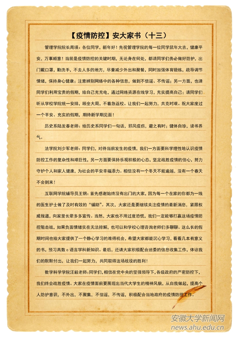 本网讯(新闻中心)新型冠状病毒感染的肺炎疫情发生以来,安大师生积极响应党中央号召,严格落实省委省政府、省教育厅及学校疫情防控领导小组统一部署安排,齐心协力,众志成城。三万多名安大人虽然天各一方,但是心在一起,我们将和全国人民一道打赢这场疫情防控阻击战!