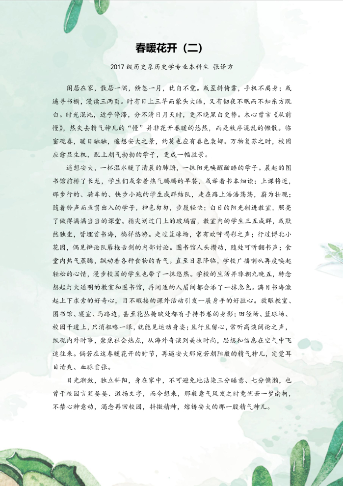 本网讯(新闻中心)疫情当前,安徽大学积极响应教育部“停课不停教、不停学”的号召,各教学单位将通过各种形式开展教学工作。千山万水隔不住安大师生对菁菁校园的思念,他们将深情融入字里行间,共待春暖花开。