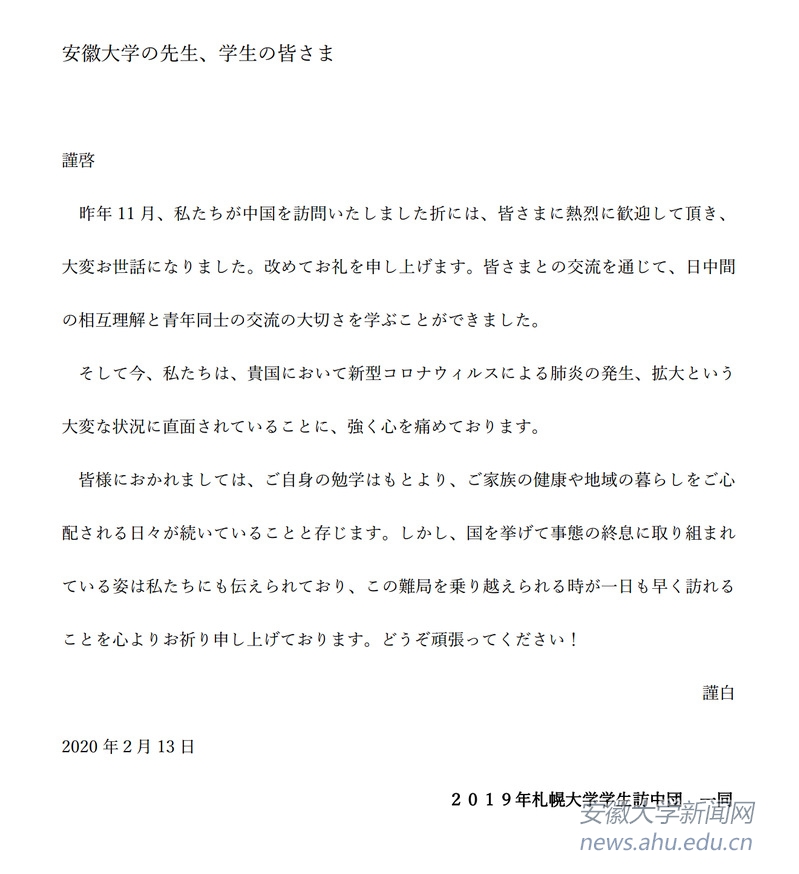 札幌大学学生访华团首先对在访问中国期间受到了我校的热烈欢迎和关照表示感谢。他们对于我国的疫情蔓延表示关心并衷心祝福疫情尽快散去,早日拨云见日。札幌大学经营学专业3年级的浅井柾至说:“感谢安徽大学在访问期间对我们的亲切接待。新闻报道新型冠状病毒的感染、蔓延让我对大家的健康感到担心,希望你们加油。”经营学专业2年级的小野有辉也表达了自己的问候和祝福:“我十分担心你们的健康和安全。请千万保重身体。希望你们能平安无事,也希望疫情能早日好转,平息。”