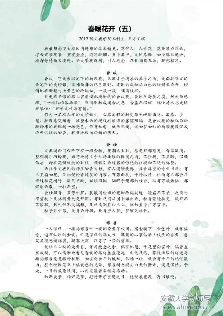 本网讯(新闻中心)疫情当前,安徽大学积极响应教育部“停课不停教、不停学”的号召,各教学单位将通过各种形式开展教学工作。千山万水隔不住安大师生对菁菁校园的思念,他们将深情融入字里行间,共待春暖花开。