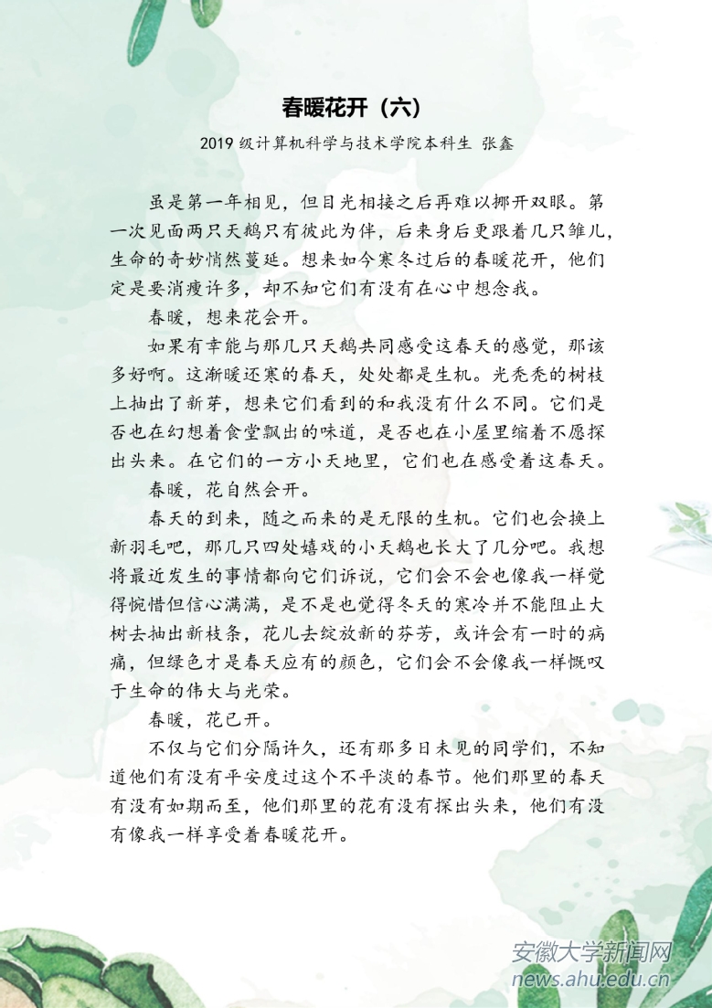 本网讯(新闻中心)疫情当前,安徽大学积极响应教育部“停课不停教、不停学”的号召,各教学单位将通过各种形式开展教学工作。千山万水隔不住安大师生对菁菁校园的思念,他们将深情融入字里行间,共待春暖花开。