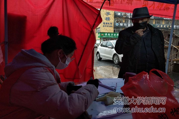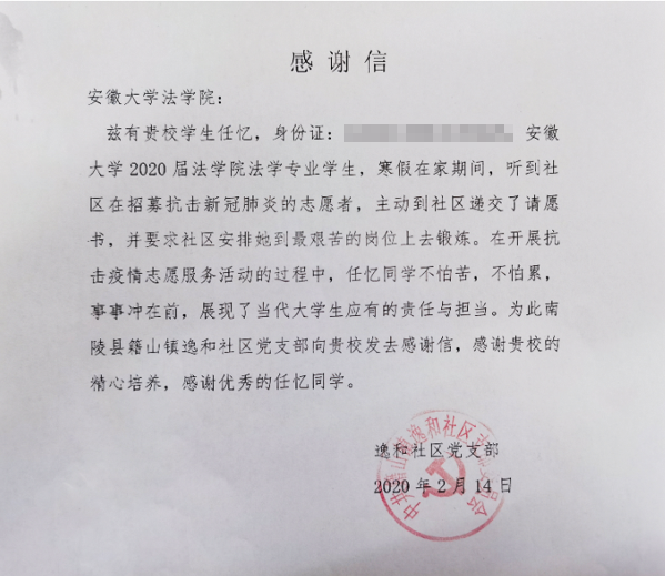 2016级本科生任忆是芜湖市南陵县籍山镇逸和社区的抗击新冠肺炎的志愿者团队中的一员。在得知社区招募抗击新冠肺炎志愿者的消息后,她向社区递交了请愿书并恳请社区将她安排到最艰苦的岗位上去锻炼。任忆表示:“社区里很多工作人员在防疫期间坚守岗位,他们的行为很令我感动。希望广大市民们遵从社区关于防疫工作的指示,安心在家等待疫情好转,更希望疫情能尽早结束。”
