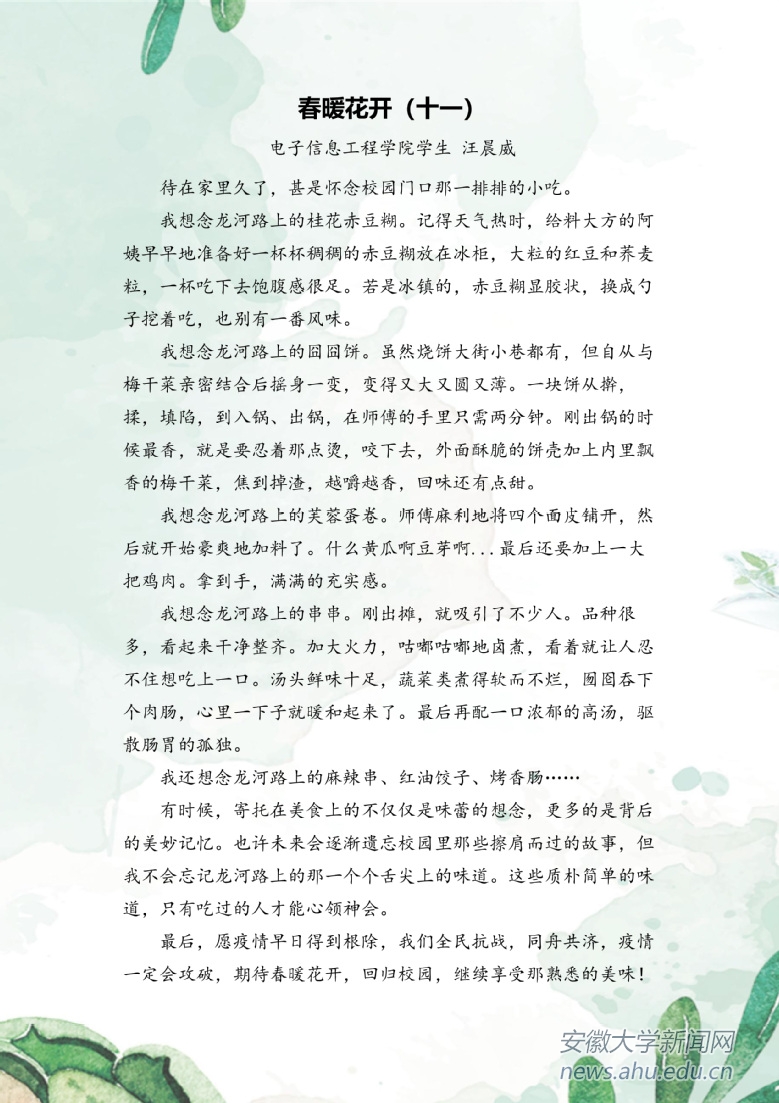 本网讯(新闻中心)疫情当前,安徽大学积极响应教育部“停课不停教、不停学”的号召,各教学单位通过各种形式开展教学工作。千山万水隔不住安大师生对菁菁校园的思念,他们将深情融入字里行间,共待春暖花开。