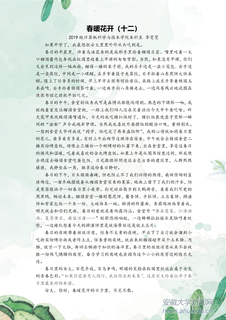 本网讯(新闻中心)疫情当前,安徽大学积极响应教育部“停课不停教、不停学”的号召,各教学单位通过各种形式开展教学工作。千山万水隔不住安大师生对菁菁校园的思念,他们将深情融入字里行间,共待春暖花开。