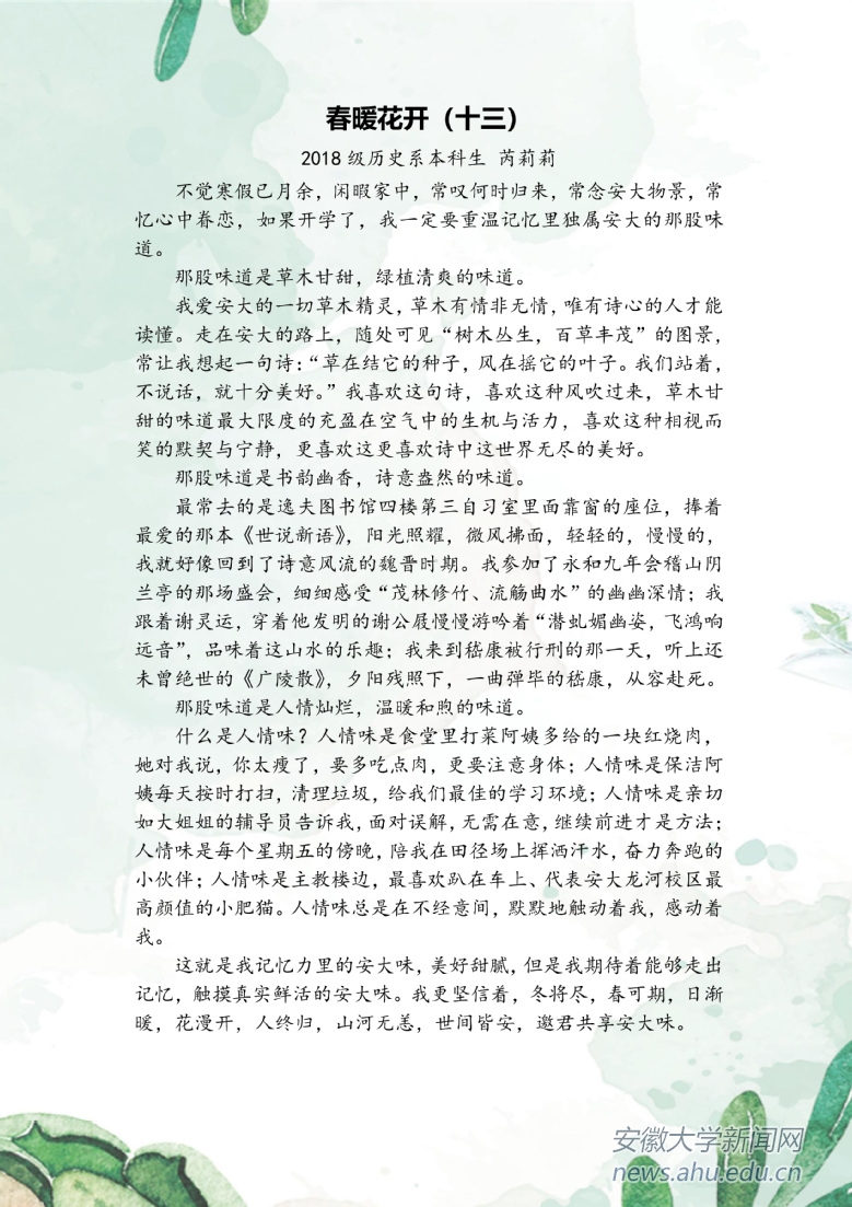 本网讯(新闻中心)疫情当前,安徽大学积极响应教育部“停课不停教、不停学”的号召,各教学单位通过各种形式开展教学工作。千山万水隔不住安大师生对菁菁校园的思念,他们将深情融入字里行间,共待春暖花开。