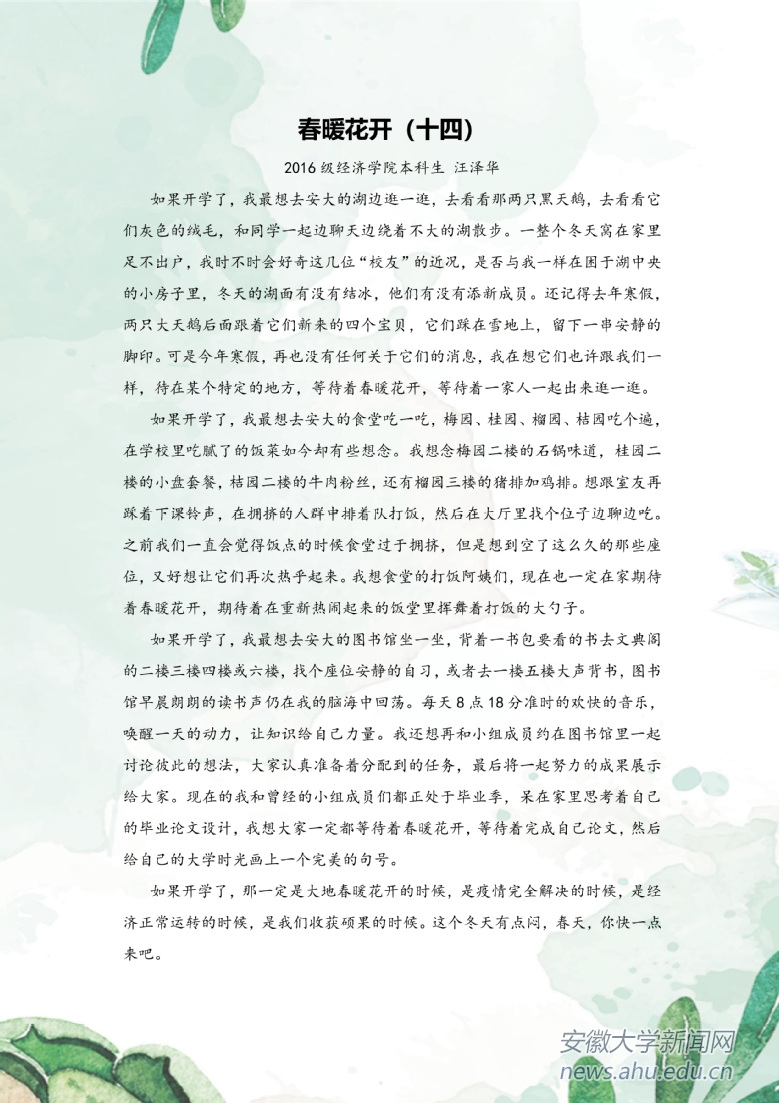 本网讯(新闻中心)疫情当前,安徽大学积极响应教育部“停课不停教、不停学”的号召,各教学单位通过各种形式开展教学工作。千山万水隔不住安大师生对菁菁校园的思念,他们将深情融入字里行间,共待春暖花开。