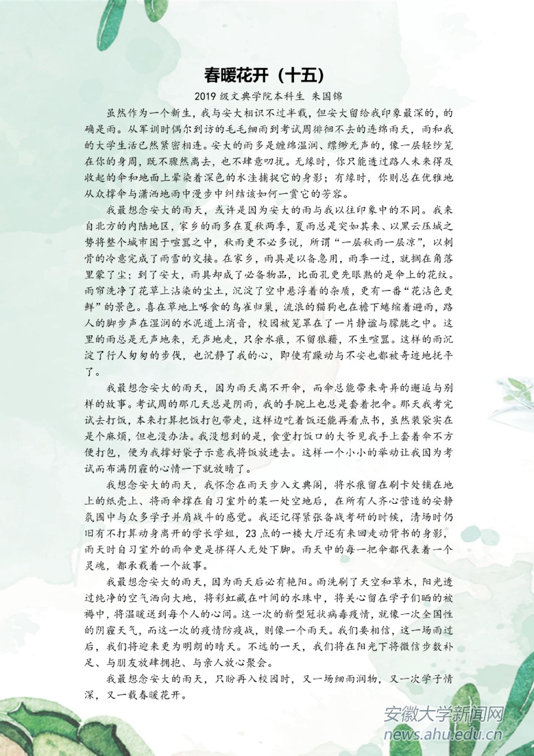 本网讯(新闻中心)疫情当前,安徽大学积极响应教育部“停课不停教、不停学”的号召,各教学单位通过各种形式开展教学工作。千山万水隔不住安大师生对菁菁校园的思念,他们将深情融入字里行间,共待春暖花开。