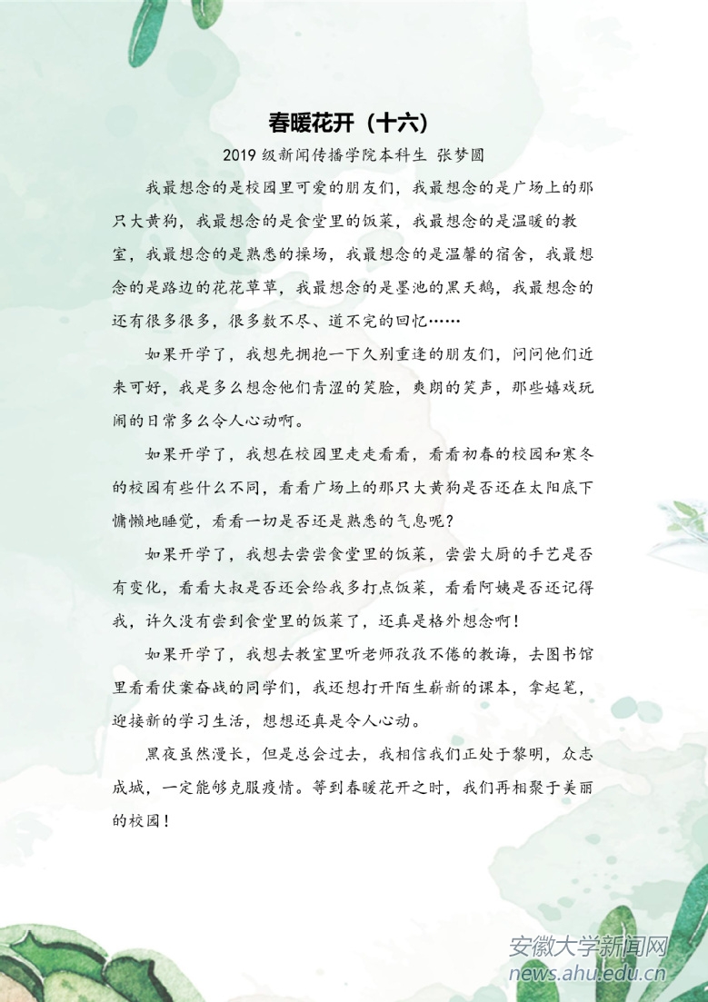 本网讯(新闻中心)疫情当前,安徽大学积极响应教育部“停课不停教、不停学”的号召,各教学单位通过各种形式开展教学工作。千山万水隔不住安大师生对菁菁校园的思念,他们将深情融入字里行间,共待春暖花开。