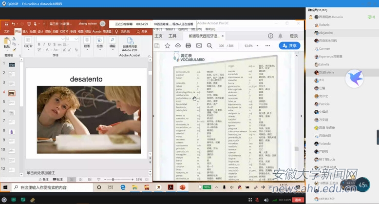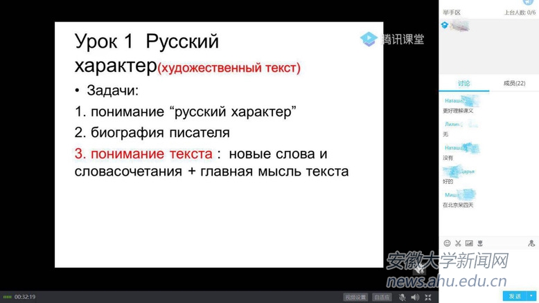屏幕另一端的学生自觉打卡签到、积极讨论,打消了英语系任娟娟老师在开课前“担心自己唱独角戏”的顾虑,也让她在接下来的课程中充满信心;第一次通过网络平台讲授法语课程的法语系赵吉鹏老师认为这是一种很好的尝试,可以锻炼学生的自主学习和自我管理能力;为了让学生有效掌握知识,日语系陈雪老师备课时制作了比线下课堂现场更详尽的PPT材料,并配有讲解充分的录音;俄语系吴琼老师表示这种教学模式使师生更加专注,也更便于收集全体学生的反馈以调整授课重点;线上连麦的方式让老师能够更清楚地了解学生的发音,这让德语系汪清波老师深感欣慰;观看直播时上涨的人数、屏幕上一条接一条的留言和为了回答问题及时切进来的连麦申请让西班牙语系张婧老师深切感受到自己与学生之间实实在在的联系。