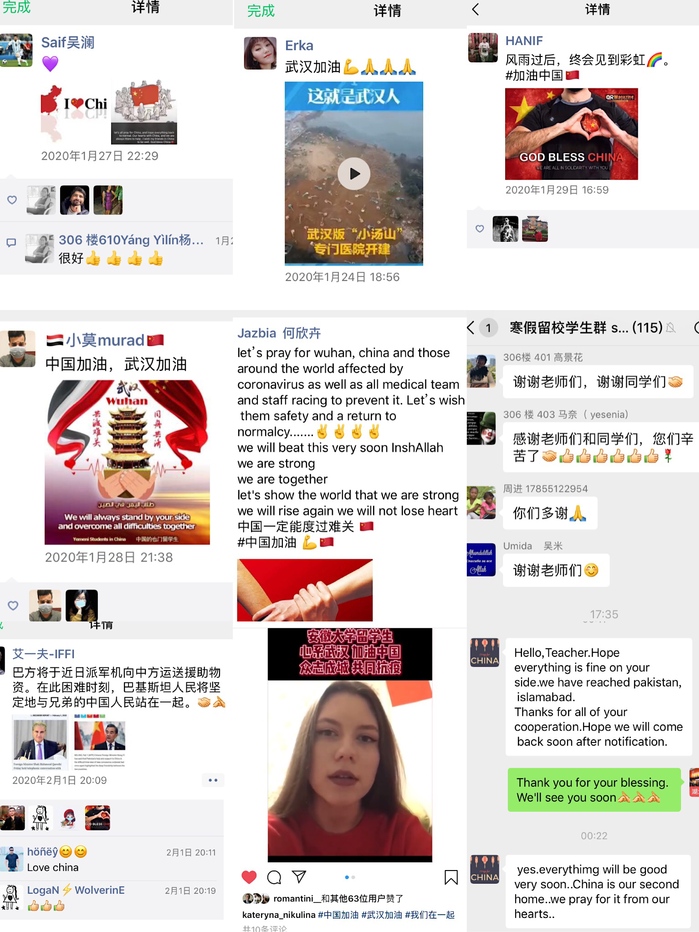 学校国际教育学院的留学生在配合学院工作的同时,也在用实际行动支持这次抗“疫”战!来自也门的莫亚德是我校一名本科生,中国爆发新型冠状病毒疫情后,莫亚德在寒假留校学生群里发了一封长长的“信”,“即使我的国家派遣飞机接我回去,我也不会离开中国!我爱中国人!我爱老师们,也爱我的同学和中国朋友!中国加油!”来自乌克兰的留学生娜斯佳说:“中国政府有能力快速控制疫情。我看到中国人在7天内高效地在武汉建造起了两所大型医院,我看到勇敢的医生护士前往武汉救死扶伤,我也看到世界人民用合作的态度与方式解决问题,白俄罗斯、日本、韩国等国家提供国际援助。”来自老挝的李思娜是我校一名硕士生,在中国生活了4年多的她,早已将这片土地视为“第二故乡”。虽然远在老挝,但她心系中国疫情,通过手写卡片的方式为武汉、为中国加油打气!